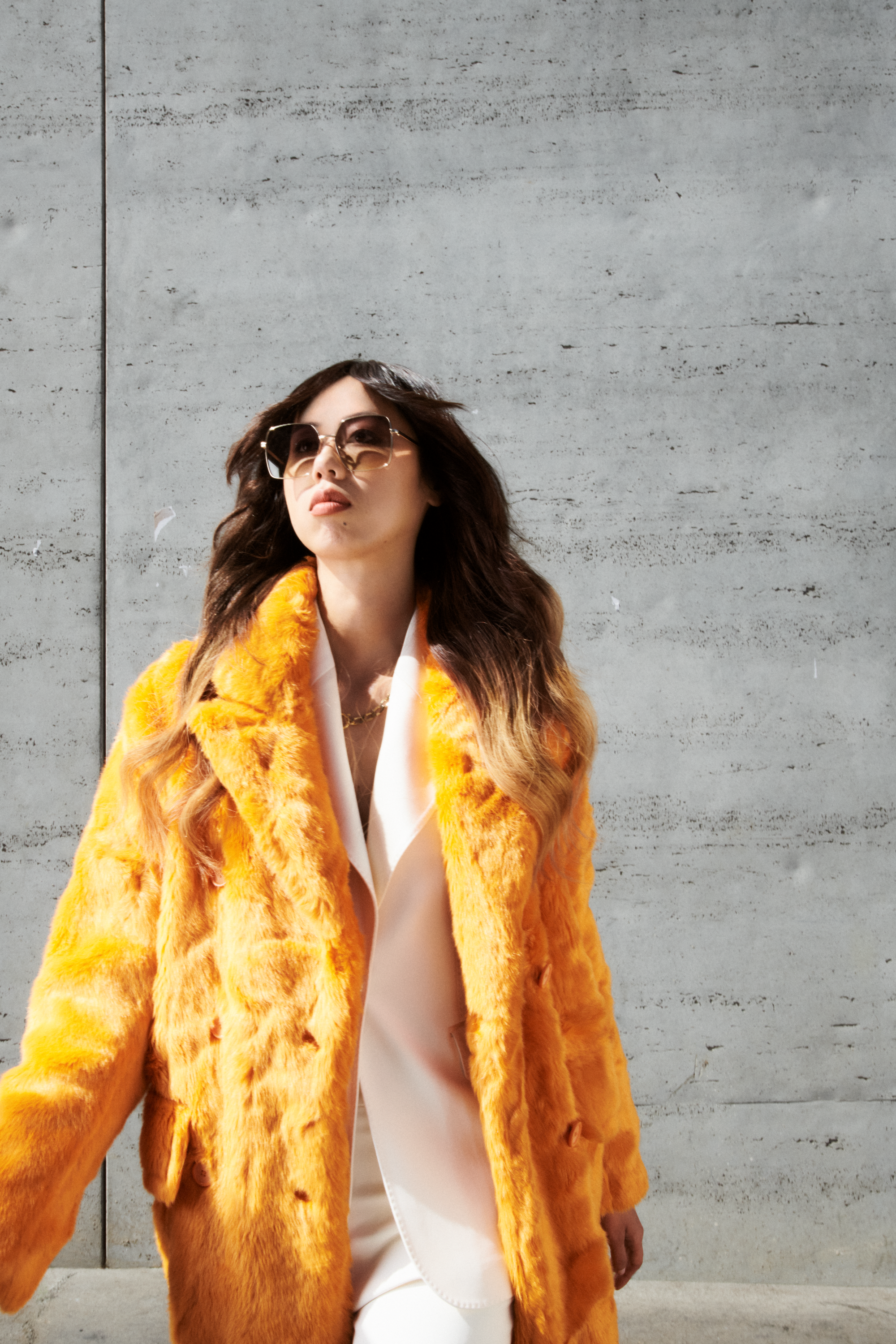 Długie falowane włosy z ponadczasową i ikoniczną grzywką typu „curtain bangs”.