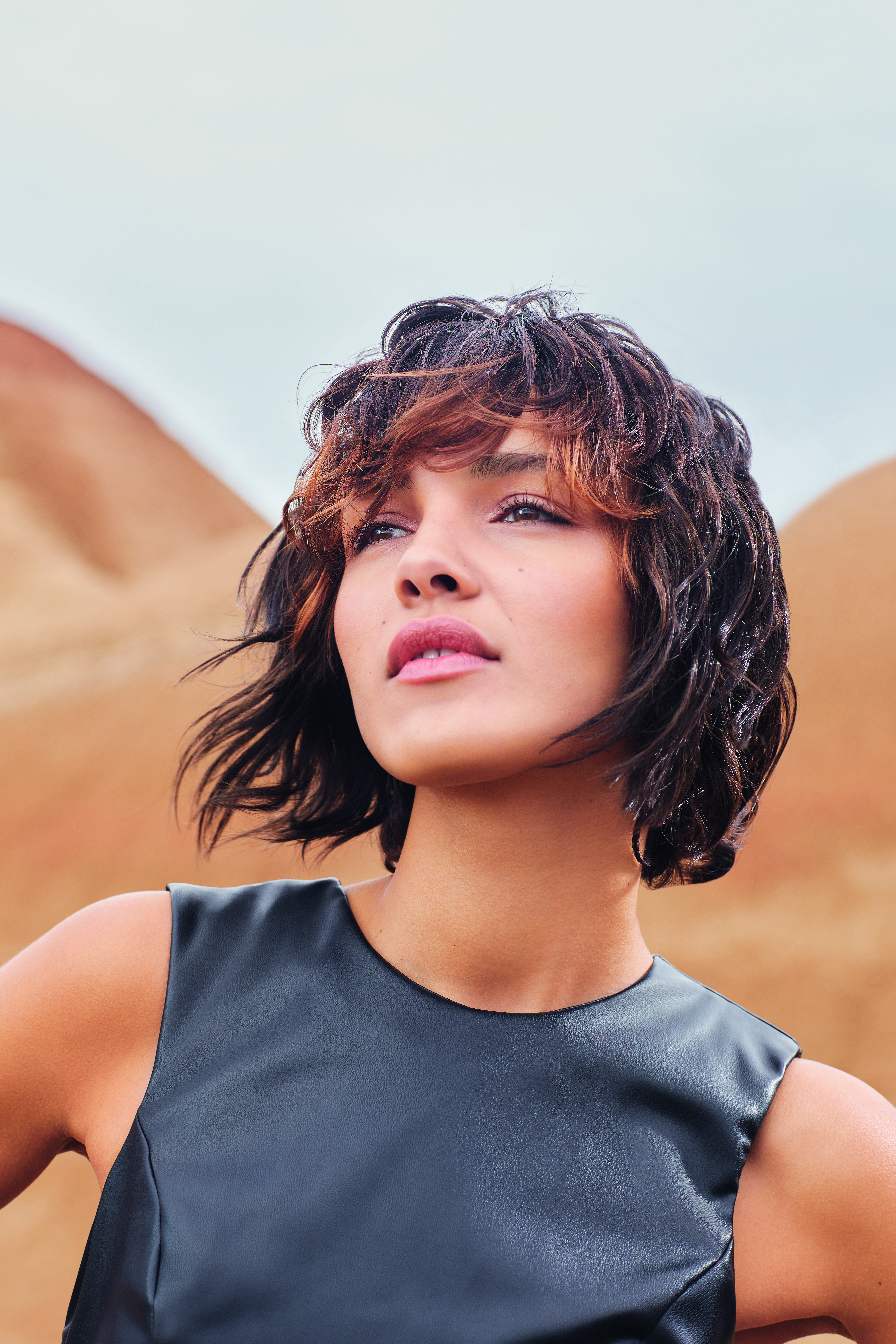 Cięcie uwzględniające dwie długości z krótką, nieuporządkowaną grzywką dodaje twarzy charakteru.