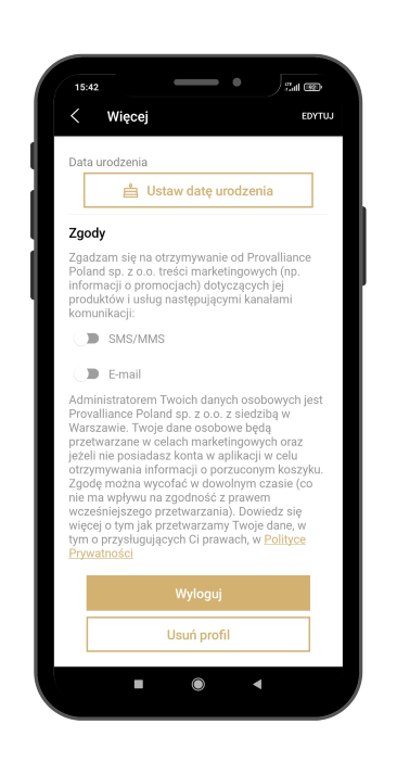 2. W Aplikacji mobilnej Jean Louis David (Więcej -> Mój Profil -> Zgody):