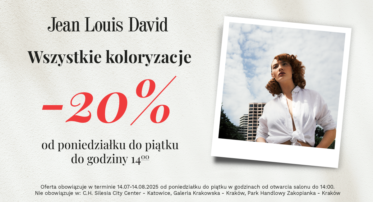 Skorzystaj z letniej promocji! Od 14.07.2025 do 14.08.2025 wszystkie koloryzacje w salonach fryzjerskich Jean Louis David 20% taniej od poniedziałku do piątku w godzinach od otwarcia salonu do godziny 14. Promocja działa również, gdy usługa rozpocznie się o godzinie 14!